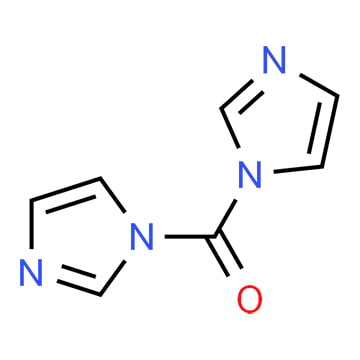 N,N’-Carbonyldiimidazole, also known as 1,1′-Carbonyldiimidazole, Carbonyldiimidazole, Di(1H-imidazol-1-yl)methanone, is a derivative of imidazole. Its imidazole structure has a closed large P bond, and there is a pair of lone pair electrons on the unbound sp2 orbital of one of the nitrogen atoms. These features gives Carbonyldiimidazole strong chemical reactivity, which means it can react with functional groups such as ammonia, alcohols, and acids to synthesize many compounds that are difficult to obtain if using general synthesizing methods.